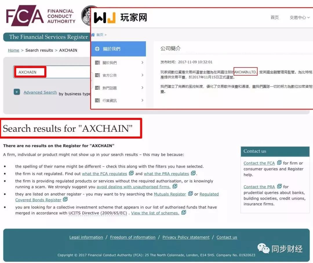 尽管玩家网官方号称“运营主体为在英国注册的AXCHAIN.LTD,受英国金融管理局监管”,但同步财经在英国金融管理局的官方网站上却并没有找到AXCHAIN的相关信息,玩家网的域名和各种联系方式也都巧妙的隐藏了关键信息,显然玩家网的所有者试图把自己藏起来。