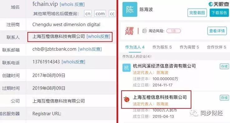据同步财经调查,Fchain.vip的域名并没有像玩家网官方域名一样做了大量隐私保护处理(阿里云无法为.VIP域名提供隐私保护服务),可以直接查出这一域名所有者为上海互橙信息科技有限公司,注册电话与陈海波一致,在天眼查上查询,上海互橙信息科技有限公司的法人和大股东也是陈海波。