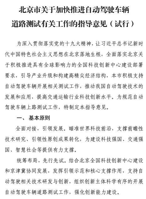 附件一:北京市关于加快推进自动驾驶车辆道路测试有关工作的指导意见(试行)