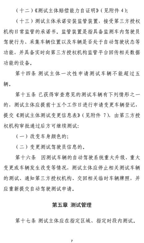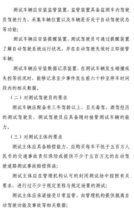申请道路测试的车辆必须符合国家机动车运行安全技术条件,并且具备自动、人工两种驾驶模式,可在两种模式间随时切换;