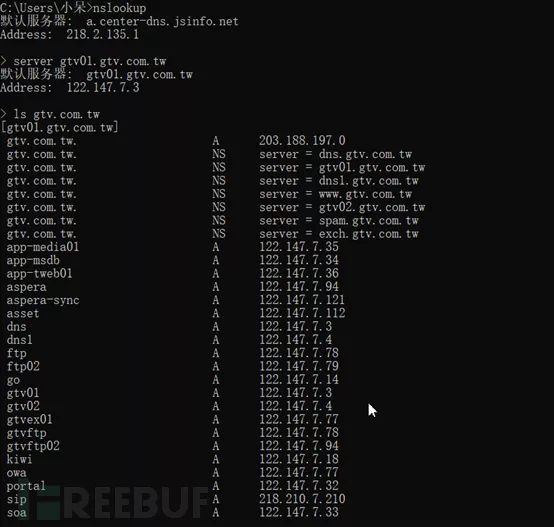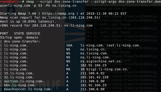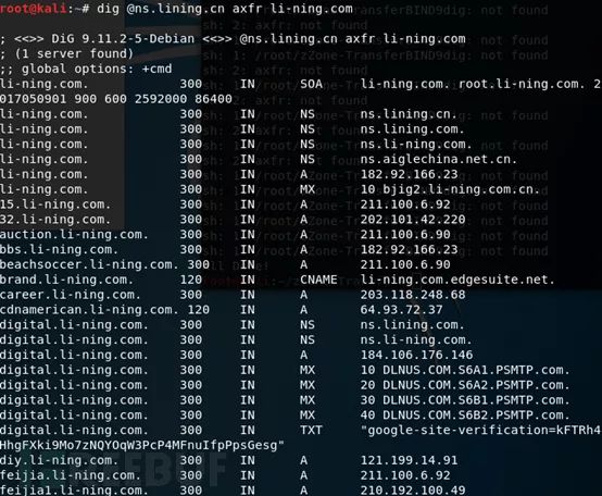 dig @ns.lining.cn axfr li-ning.com@ 指定域名服务器; axfr 为域传送指令; xxx.edu.cn 表示要查询的域名;