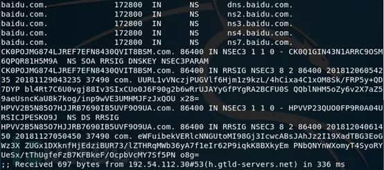 【此处可以用dig @192.54.112.30 www.baidu.com查看返回的百度顶级域名服务器IP地址】。