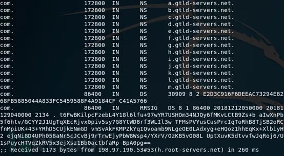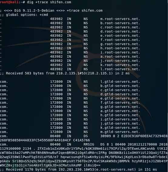 第一步是向我这台机器的ISPDNS(218.2.135.1)获取到根域服务区的13个IP和主机名[a-m].root-servers.net.。