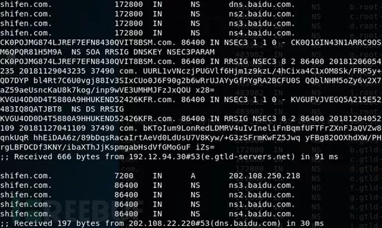 第三步的时候发现shifen.com这个顶级域名的域名服务器和baidu.com这个域的域名服务器是同一台主机。(dns.baidu.com)