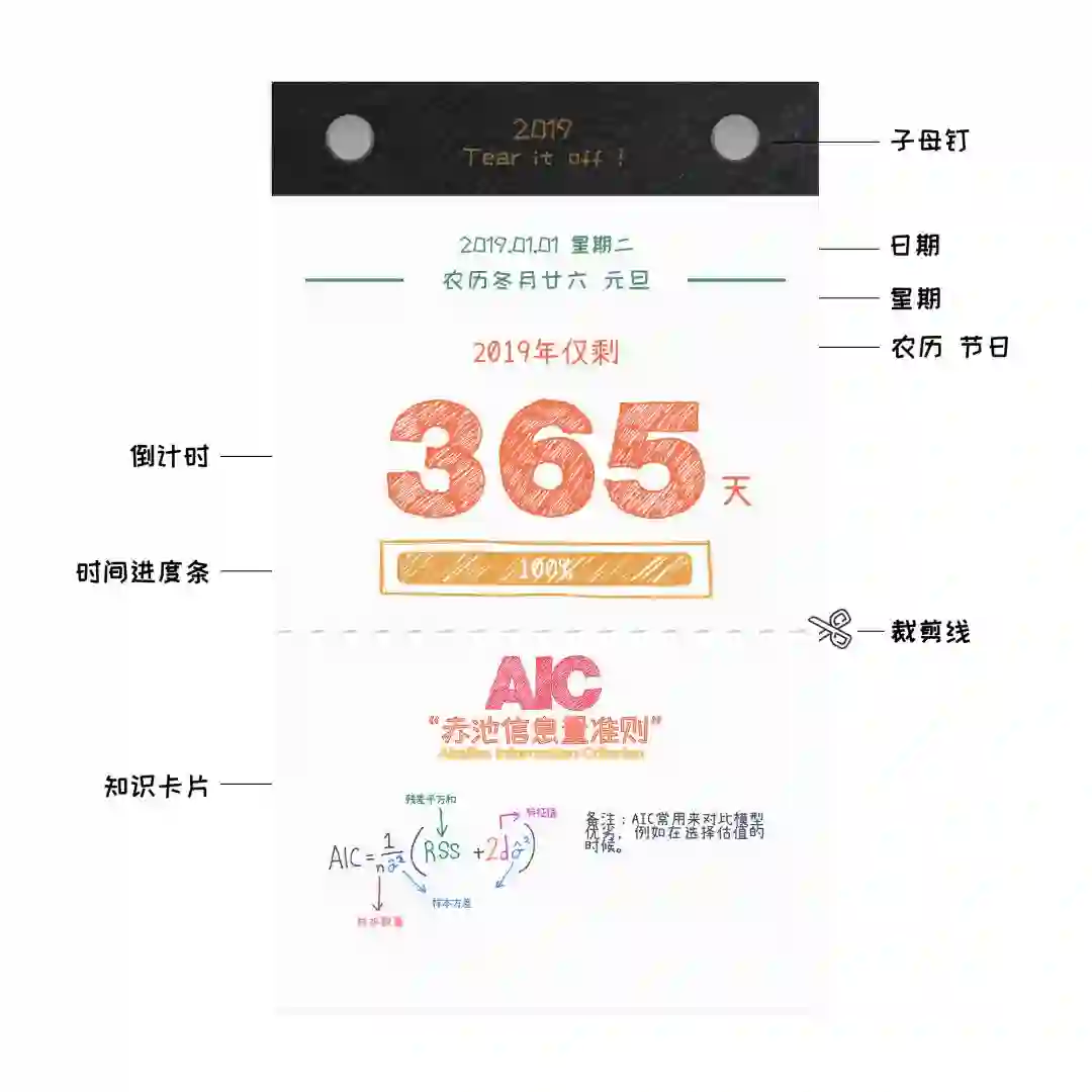 在这套日历中,不仅有每天一个的机器学习概念表,还配有一只每天都在变少的倒计时“电量格”,让时间的流逝和知识的积累都看得见。