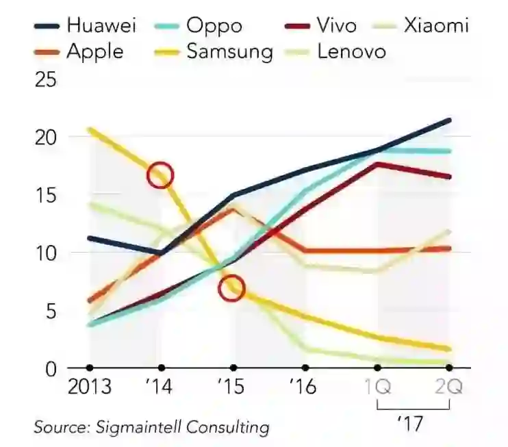 手机爆炸的阴云笼罩着三星,两年久久未散去。这一影响直接导致三星之后在中国手机市场萎靡不振,Strategy Analytics 的最新数据报告显示,2017 年第 4 季度三星的市场占有率仅为 0.8%,颇有要成为「第二个 1%」的架势。纵观 2017 年全年,三星在中国市场的占有率也仅为 2.1%。要知道在鼎盛时期,2013 年的三星曾霸占超过 30% 的中国市场份额。昔日霸主如今落得这番田地,不禁令人唏嘘。