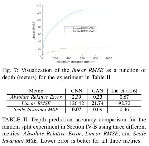随后作者训练了两个深度神经网络模型来估计远距离的深度值:i) 一个卷积神经网络 (CNN)和 ii) 一个生成对抗网络 (GAN)。作者从他们的实验中发现GAN模型预测的深度值更加精确。作者计划开源特闷的数据可以及极限模型。