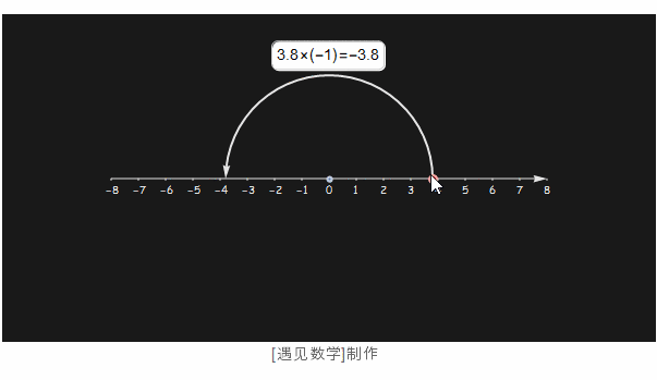 再来看下图中, 任何实数乘以 -1 的结果都会落在关于原点对称相应的位置上. 所以乘以 -1 的计算可以理解为该点(数)绕着原点旋转了半圈.