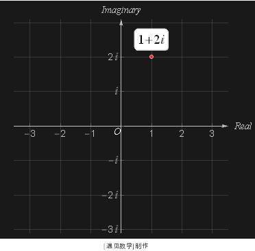 这个没在实数轴上奇怪的点实际上落在复数平面(complex plane, 或称为阿尔冈平面)上了, 所有在复平面上的数都满足 z=a+b i 这样的结构, 称之为复数. 其中 a 称为实部(real part), b 为虚部(imaginary part). 如下图 1+2i 复数, 1 和 2 是实数, i 是虚数单位, 这样的复平面几何表示如下图所示: