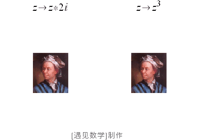 如果对图片中的每一点做复数运算的变换, 可以得到各种有趣的平面变换图像. 这里为了纪念欧拉大神, 就以他老人家头像为例, 比如做乘以 2 i 的函数变换 - 旋转 90°, 同时放大了2 倍的变换; 另一个变换函数为三次方, 你也可以思考为什么会变成这个形状呢? :-)