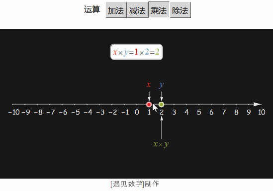 先来看看在实数轴上两个数的加减乘除这 4 种运算. 观察到红蓝两个点(数), 在不同的计算下, 其结果(绿点)的变化, 不管数怎样变化, 都总还落在数轴上(除法分母为 0 时候, 当然没有意义).