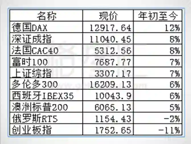 如果我们倒着去看,也是涨多跌少,垫底的依然是创业板,其他排名靠后的主要是欧洲的指数,但也都是上涨,只是涨幅可能相比全球来说并不高。