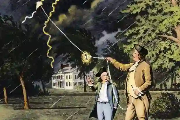 风筝实验——富兰克林将系着钥匙的风筝用金属线放到云层中,闪电击中钥匙,顺着金属线被富兰克林的手感知到。