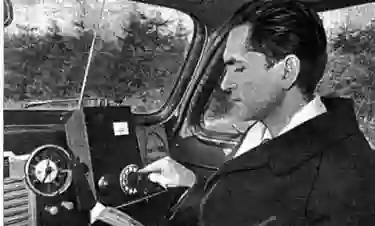 列昂尼德.库普里扬诺维奇正在测试ЛК-1型便携移动电话(来源:苏联《За рулем》杂志,1957年第12期)