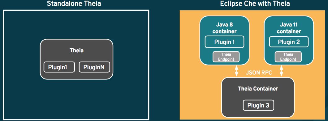 Eclipse Che 是一个使用容器技术的开发者工具。Theia 插件使用 TypeScript/JavaScript 编写,二者兼容非常好。但是插件作者有时候需要一些额外的依赖,这些依赖不一定存在于 npmjs 中。例如,如果开发者为 Java 编写一个语言服务器,那么插件就需要 Java 的支持。因此这就可能会影响运行了 Eclipse Theia 的容器,容器本身也需要提供 Java 的支持。