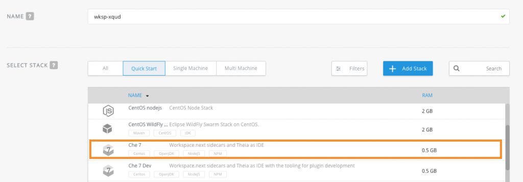 或者到 che.openshift.io 注册新账号并创建新的工作空间,然后选择 Che 7 栈。