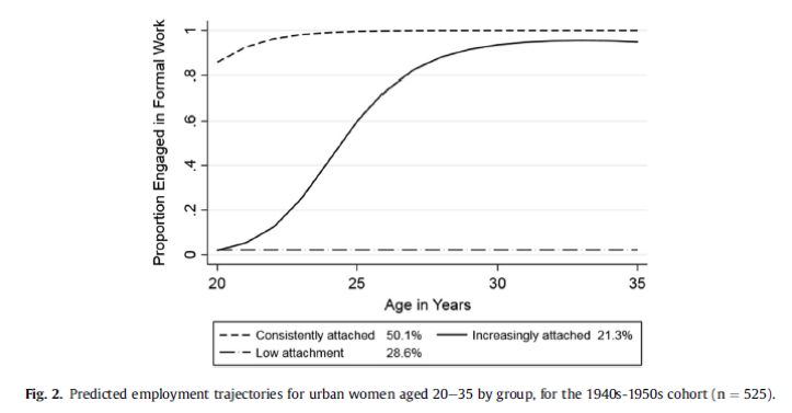 市场转型也扩大了社会阶层间的不平等,而少有研究进一步分析不同女性群体间“生育代价”的差异(於嘉、谢宇,2014)。处于不同社会阶层的女性,拥有不同的资源和机会,面临不同程度的困境,因此转型期间女性的经历不能一概而论。我和合作者最近发表的一项研究(Sunand Chen, 2017),运用2008年中国综合社会调查(CGSS)中的工作史数据,考察了三代(40-50后、60后、70后)城镇青年女性从20到35岁的正式就业轨迹在社会经济转型的不同时期如何变化,以及不同就业轨迹和初婚年龄、所处社会阶层之间的关系。