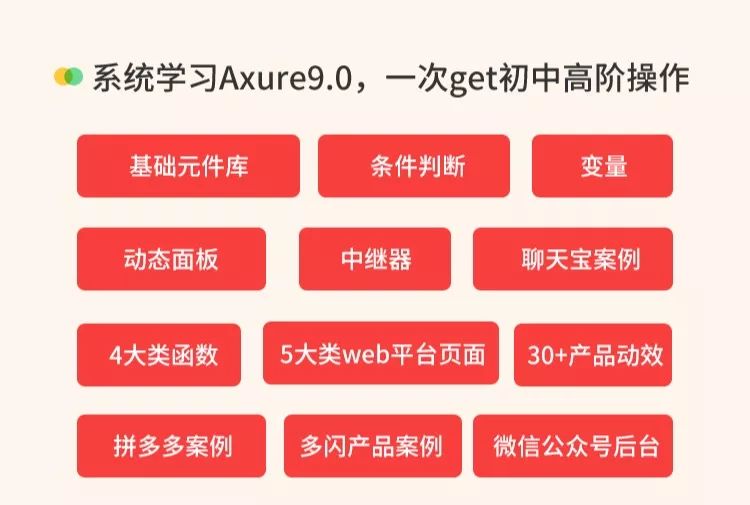 你以往不会的Axure常用功能,都能掌握;之前使用过的Axure功能,能深入掌握更多实用用法。