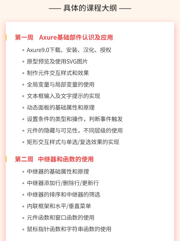 Axure实战班安排了6次直播课,老师会在直播课上讲解更多的交互和产品设计。让你在学Axure的同时,培养对产品的理解,对交互的感觉