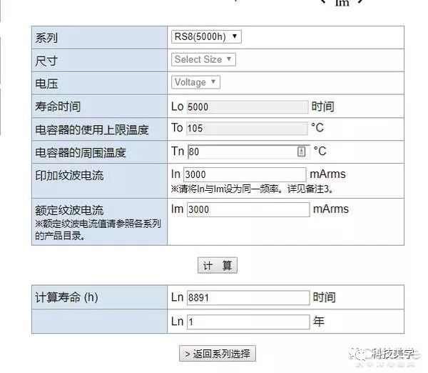 电容温度与寿命的关系其实是可以算出来的,尼吉康官网上就提供了一个公式可供大家计算电容的寿命,上图以长寿命的RS8系列为例算了下,在80°C温度下寿命有8891个小时。