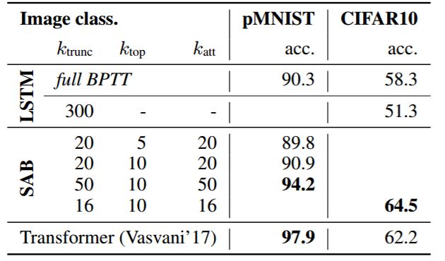 训练循环神经网络的常规做法是利用基于时间的反向传播算法,该算法在处理长序列时计算开销十分昂贵,甚至不可行。针对这一问题,本文提出了一种新的算法SAB,通过提醒机制实现时序信用分配。在稀疏性限制最大的条件下(不利用过去的经验),SAB 将退化为使用常规的静态神经网络。在稀疏性限制最小的条件下(利用过去所有的经验),SAB 将退化为完全使用自注意力机制。该方法在涉及长期依赖关系的任务中比 BPTT 和截断的 BPTT 相当甚至更优。