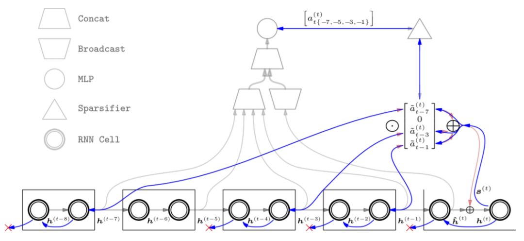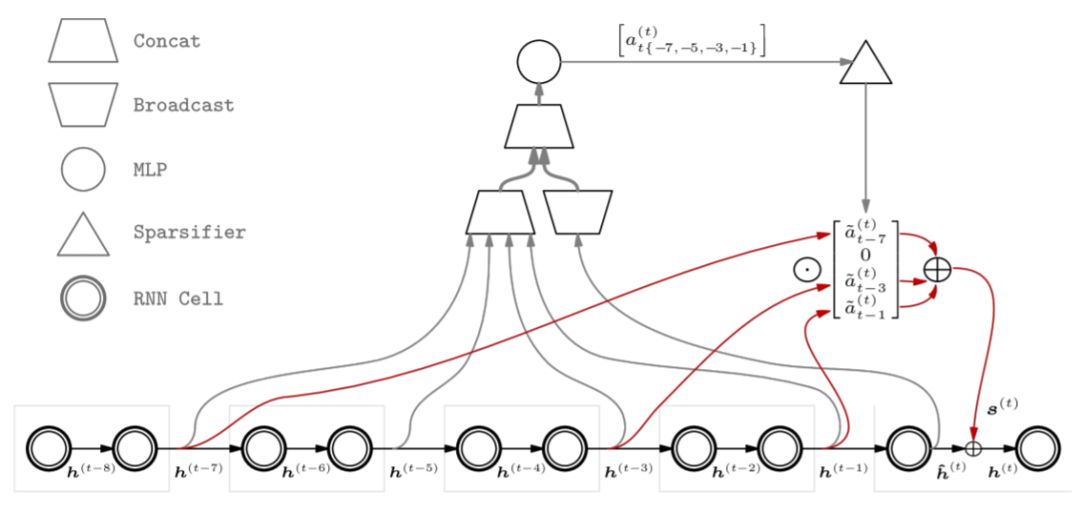 图 1: 此图展示了在 ktop = 3, katt = 2, ktrunc = 2 的情况下 SAB 中的前馈传播过程。该过程将稀疏检索(第 3.1 节)和对记忆的总结引入了下一个 RNN 隐藏状态。灰色箭头显示了注意力权重 a(t)是如何被估计出来的,首先通过广播和连接所有记忆的集合 M 当前的临时隐藏状态 hˆ(t),并且通过多层感知机计算出原始注意力权重。稀疏处理器会选择出最大的 ktop 个原始注意力权重,并进行归一化处理,而其它的注意力权值则表示为 0。红色箭头显示了对应非零稀疏化注意力权值被加权求和的过程,然后将其添加到临时隐藏状态 hˆ(t) 中去计算最终的隐藏状态 h (t)。