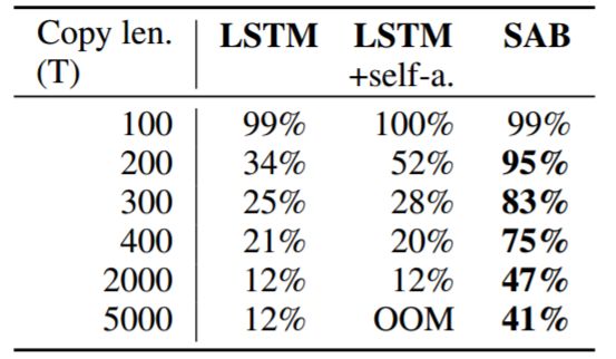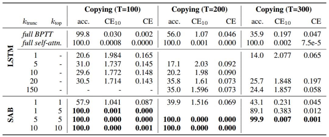 表 5:在 T=100 的复制记忆任务中训练的模型的迁移性能(最后 10 位数的准确率)。该表将使用基于时间的反向传播算法(BPTT)训练的 LSTM 以及带完全的自注意力机制的 LSTM 结果相对比。