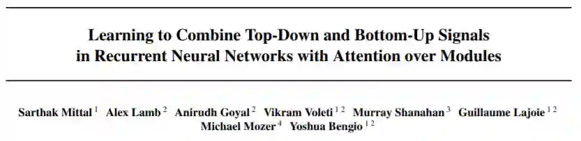 Bengio提到的发表在ICML2020的论文是《Learning to Combine Top-Down and Bottom-Up Signals in Recurrent Neural Networks with Attention over Modules》,感兴趣的同学可以去看看: