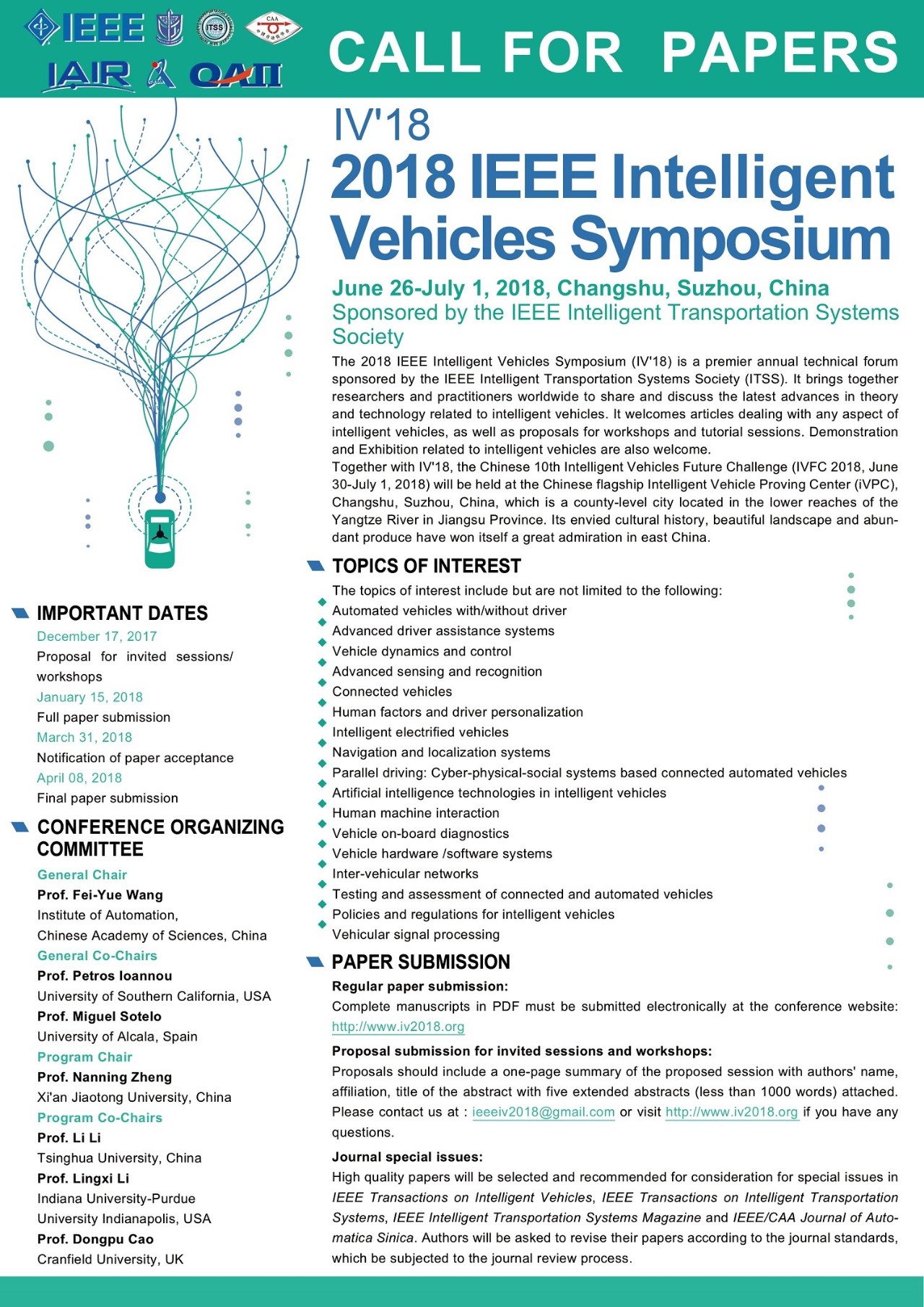 第29届国际智能车大会(IEEE IV 2018)是由IEEE智能交通系统协会(ITSS)主办的年度技术论坛。旨在为智能汽车领域的全球研究人员和技术从业人员分享和讨论智能汽车相关的理论和最新的技术进展。在大会开始前一天,将举办面向智能车辆的若干研讨会(workshop)。现面向全球智能车辆从业人员,邀请组织研讨会(workshop)、征集研讨会(workshop)建议,研讨会(workshop)主题不限但须与大会(IEEE IV 2018)征文范围一致。