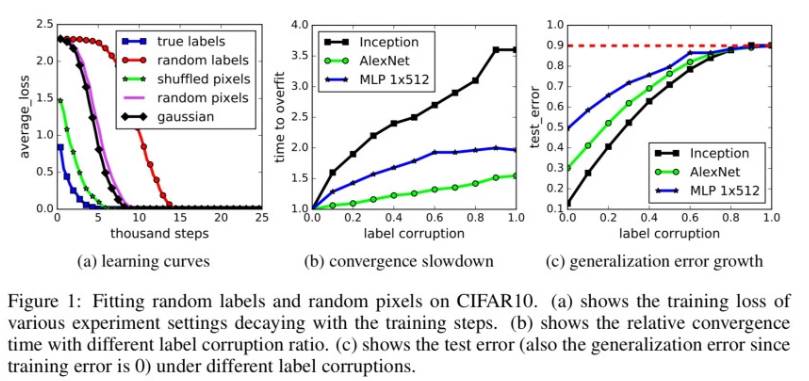 如果你用随机标签训练网络,然后看网络在测试集中的表现,这个表现显然不好,这是因为网络没有学习到数据集的正确信息。这一问题的一个奇怪描述是它具有高泛化误差。将这些情况综合考虑,你能理解到: