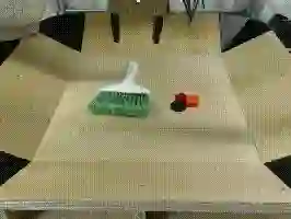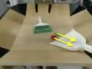 在前文提到的任务中,机器人使用附近的扫把来更有效地执行任务:
