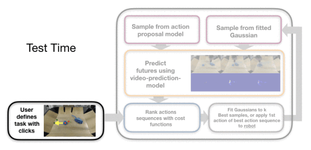 在测试时,机器人可以使用模拟数据训练的模型来指导动作计划过程和预测模型,以确定采取哪些动作可以完成它要执行的任务。