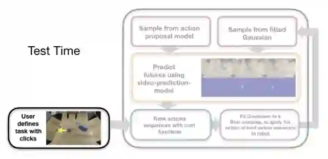 我们使用基于抽样的动作计划程序,利用动作设计和视频预测模型,使机器人可以使用不同的工具和物体来完成各种任务。需要指出的是,动作序列最初是来自动作设计模型的随机采样。然后,我们再通过视频预测模型来预测每个动作计划的结果。