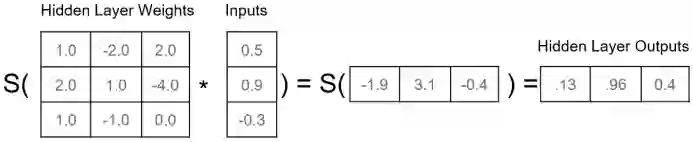 e) 矩阵公式:上面输入层到隐藏层的三个计算公式都可以被表示为图8中的矩阵计算。矩阵计算相比上面的计算方式更适合计算机操作,可以极大增强计算并行性。同时GPU因为极好的矩阵计算能力,而被用来为神经网络训练和推理过程加速。