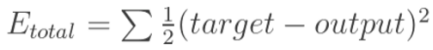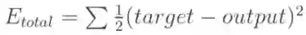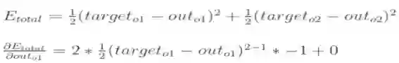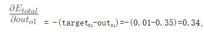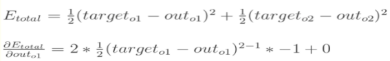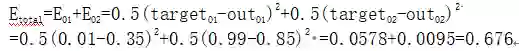 因为本例中有两个输出,所以分别计算O1和O2的误差,总误差为两者之和: