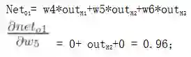 为了便于描述,我们将H1、H2、H3与O1间的权重分别称为w4、w5、w6,并查看w5对整体误差产生了多少影响,具体公式如下(链式法则:利用整体误差对w5求偏导):