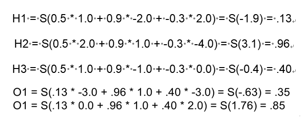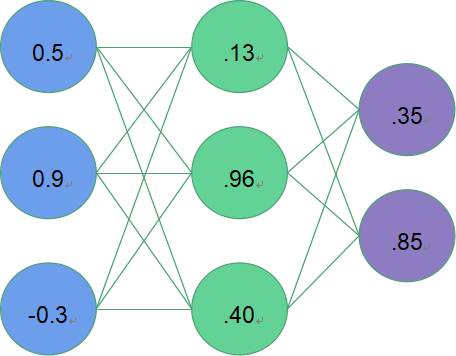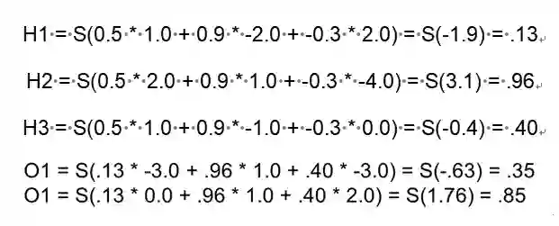 d) 推理过程:当模型学习好之后,我们如何使用模型对新数据进行推理,以图4为例,蓝色表示输入数据(输入层),绿色是隐藏层,紫色是输出层,输入层与隐藏层的权重用Hi weight表示(i代表神经元),同理,隐藏层与输出层间的权重用Oi weight表示。那么我们可以通过图6中的式子分别得到隐藏层和输出层的值(其中S表示应用于神经元上的激活函数,此处是sigmoid函数:),最终结果如图7示。可见最终得到了.35和.85,如果这是一个分类神经网络,那么我们最终可能会选择输出层的第二个神经元上的标签来对该输入值进行分类。