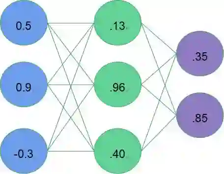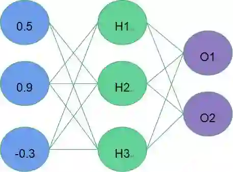 b) 神经网络架构(如图4):包含输入层(蓝色)、隐藏层(绿色)和输出层(紫色)。每一层中的神经元接收来自上一层中的神经元的信息,每一个神经元都使用一个函数来处理它的输入并得到一个输出,然后将该输出发送给下一层的神经元。
