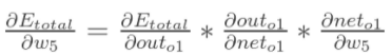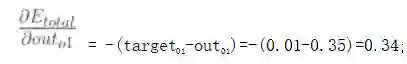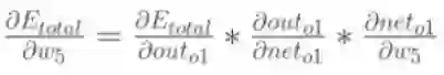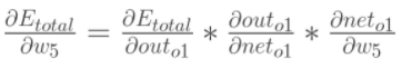 其中,out01表示最终结果0.35,net01表示没有进行sigmoid函数之前的结果-0.63,w5是1.0。可以看出我们是按照向前传播的顺序一点一点反向偏导得出具体权重误差,下面我们以w5权重更新为例,具体走一下。