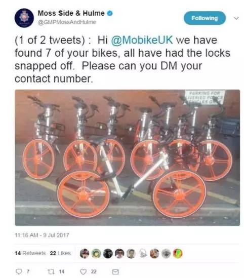 大中华区警察中心队检查员菲尔·斯普吉恩表示,自6月29日以来,他们一共收到了17起摩拜单车偷窃破坏案件。