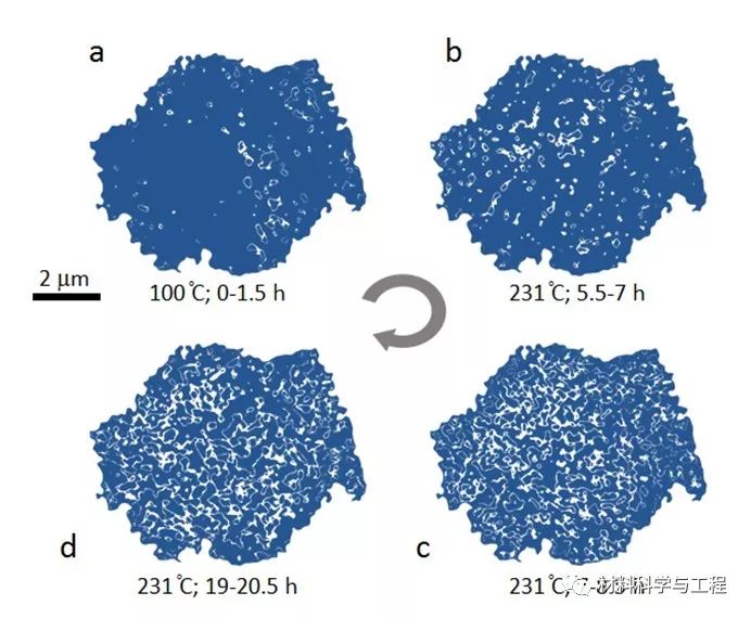 图1为Ni的价态随NMC材料加热过程的变化,其中的每一条曲线代表了相应条件下基于全部像素的Ni价态的分布情况,可以看出化学反应从开始到结束全过程Ni元素价态分布的演变情况。图2给出了四个特定反应条件下Ni等价态面的发生、发展过程,所选择的Ni价态为8341eV对应的价态。从图1可以看出,8341eV代表的价态可以代表是化学反应最剧烈情况。