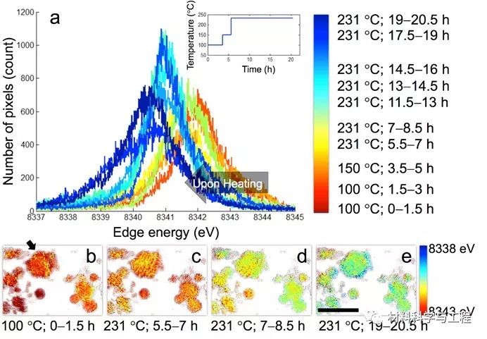 图1 NMC样品中镍元素的价态随加热过程的变化。(a)为镍元素的局域价态直方图。(b-e)为原位观测镍价态信息示意图。镍的价态由Ni 的K吸收边能量表示,高能量和低能量分别代表了高价态和低价态。