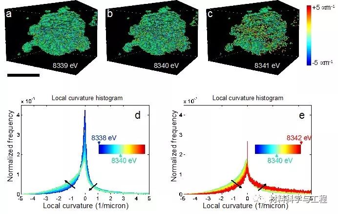 图3中用不同颜色表示了镍元素的吸收边能量代表的镍元素的价态。受由晶粒边界和其局域的化学环境(不同组分和缺陷)所影响,相变过程通常非常复杂,如图3a所示,镍阳离子三维的形貌由不同的价态组成,从相对还原态(低能量态)到相对氧化状态(高能量态)。这些三维的价态推进前端提供了一个直观的三维立体多面体。还原态和氧化态分别代表了子相和母相,相变反应的推移前端从图3a到图3c。同时,作者将这些三维多面体每个局域的曲率计算出来,并分别用红色和蓝色代表局域曲率为正值和负值。从图3d、e可以看出相变过程中局域价态曲率的演化过程。