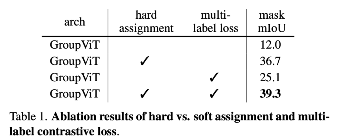 。研究者研究了表 1 的第二列中,添加多标签对比损失的效果。将多标签对比损失添加到标准损失(公式 8)中,硬分配和软分配的性能分别提高了 13.1% 和 2.6%。使用多标签对比损失,训练和推理期间的输入文本采用类似的提示格式。他们推测这种一致性有助于 GroupViT 更好地将学习到的图像片段分类为标签的类别。