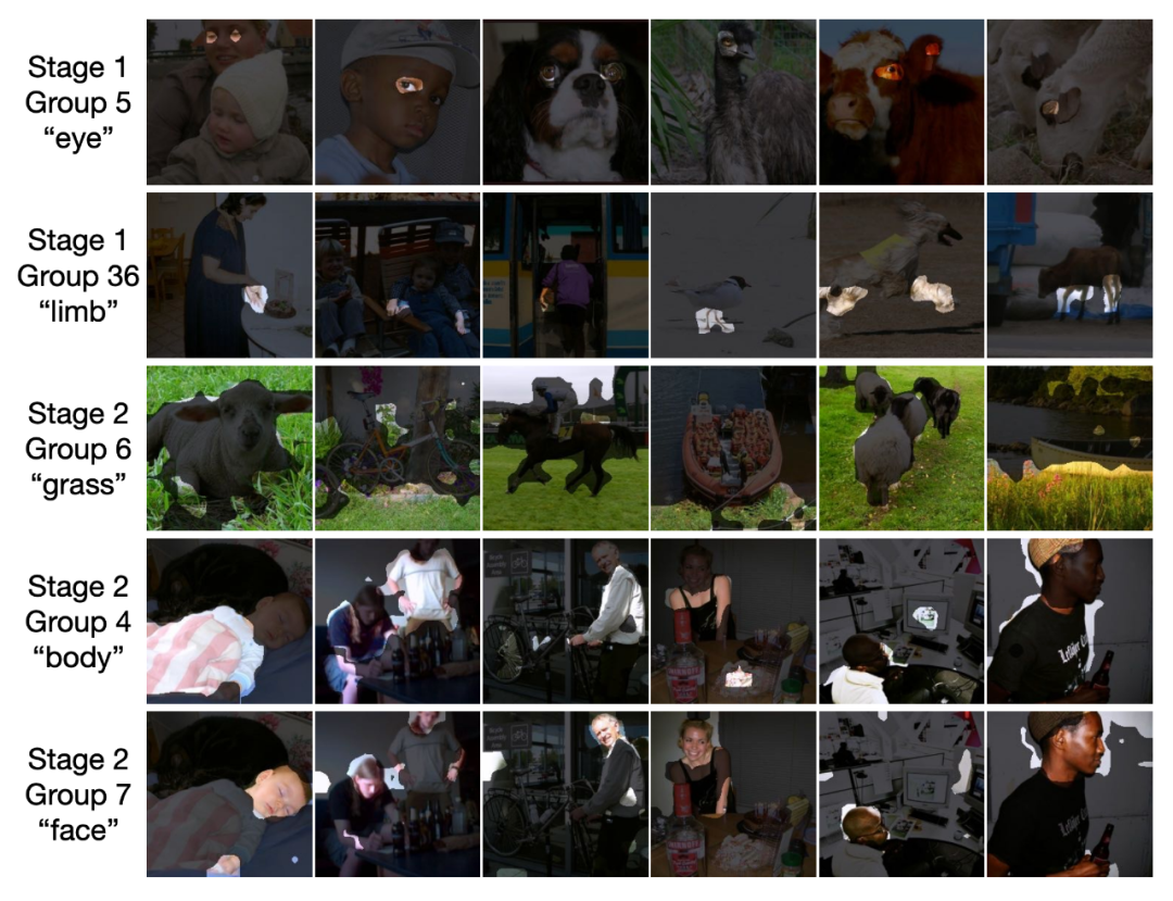他们发现不同的组 token 会学习不同的语义概念。在第一阶段,组 token 通常侧重于中级概念,例如如「眼睛」(第 1 行) 和「四肢」第 2 行)。有趣的是,如果图片中有人,组 token 36 会关注「手」,而如果有鸟和狗等动物,则会关注「脚」。第二阶段的组 token 更多地与高级概念相关联,例如「草」、「身体」和「脸」。图 7 还表明,第一阶段学习的概念可以在第二阶段聚合为更高级别的概念。