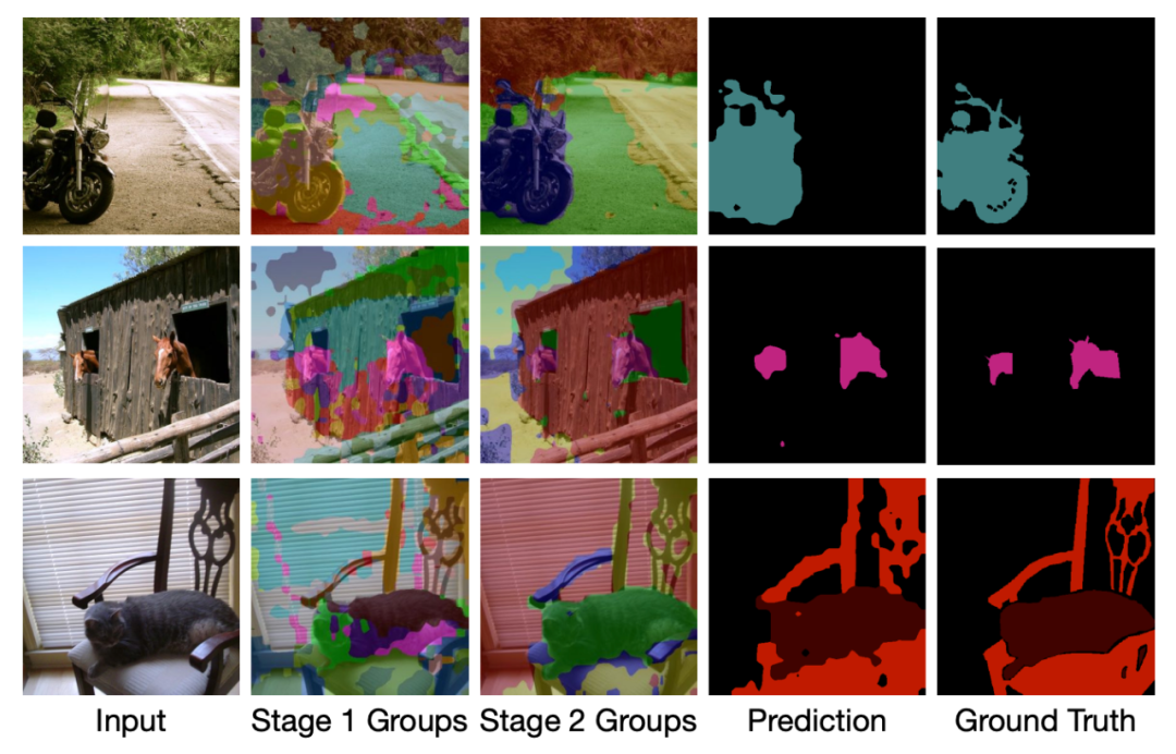 。只要通过文本监督学习,分组机制就可以自动生成语义片段。方法概览如下图 1 所示,通过对具有对比损失的大规模配对图文数据进行训练,可以让模型不需要任何进一步的注释或微调的情况下,能够零样本迁移学习得到未知图像的语义分割词汇。