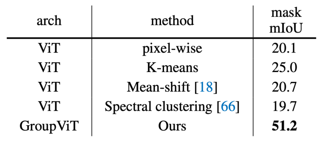 。在下表 2 中,研究者比较了不同的组 token 和输出 token。他们观察到,不断增加组 token 会持续提高性能。从概念上讲,每个组 token 代表不同的语义概念。所以更多的组 token 可能有助于 GroupViT 学习对更多的语义概念进行分组。尽管组 token 的数量远少于现实世界中的类别数量,但每个组 token 都是 384 维嵌入空间中的 1 个特征向量,但它可以表示比 1 更多的概念。他们还对不同的输出 token 进行了实验,发现 8 是最优的,类似于 [64] 中的发现。