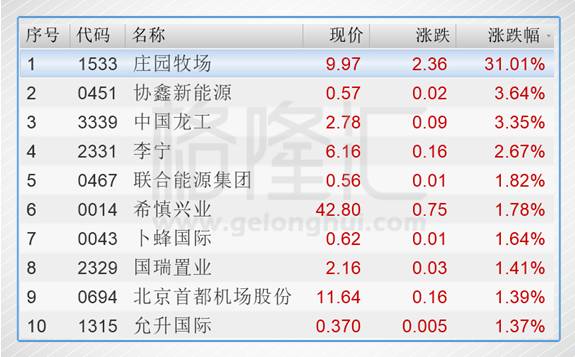今日港股通标的中涨幅前五的个股是庄园牧场(01533.HK)、协鑫新能源(00451.HK)、中国龙工(03339.HK)、李宁(02331.HK)、联合能源集团(00467.HK)。