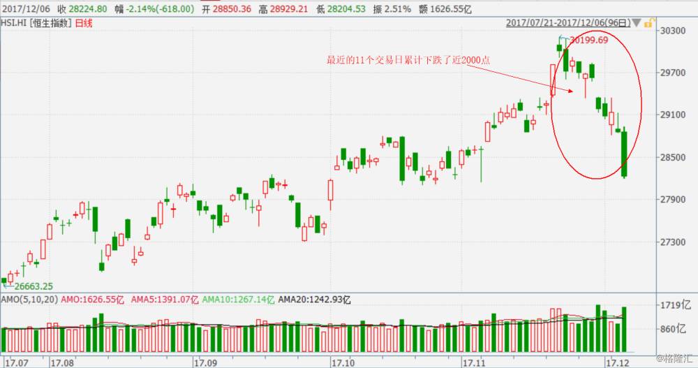 在A股市场一度大跌,美国税改影响继续发酵、美朝紧张局势升温及市场预测中国央行将收紧流动性的综合影响下,周三港股市场三大指数纷纷大幅收跌,其中恒指收报28224点,跌2.14%,进一步倒逼28000点大关,恒指短短11个交易日累计下跌了5.3%,股指跌去了近2000点;国企指数收报11162点,跌2.8%;红筹指数收报4210点,跌2.18%。