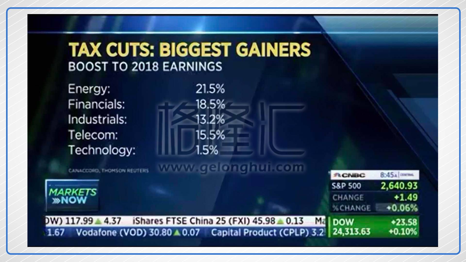 有分析人士指出,科网股继续下跌主要还是受美国税改的影响,整体来看,特朗普税改落地利好有效税负较高的本土传统企业,据CNBC数据统计,税改对能源、金融、工业、电信和科技行业的利润贡献率分别为21.5%、18.5%、13.2%、15.5%和1.5%,其中对科技行业的利好影响是最小的(如下图)。